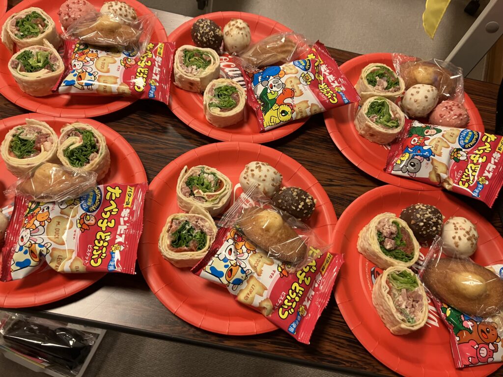 メニューはコストコの野菜たっぷりハイローラー、🍓人気のドーナツ、イタリアのマドレーヌ、昭和から食べてるたべっこどうぶつ😋カスミ先生からの差し入れ、みんなおいしかったね♡