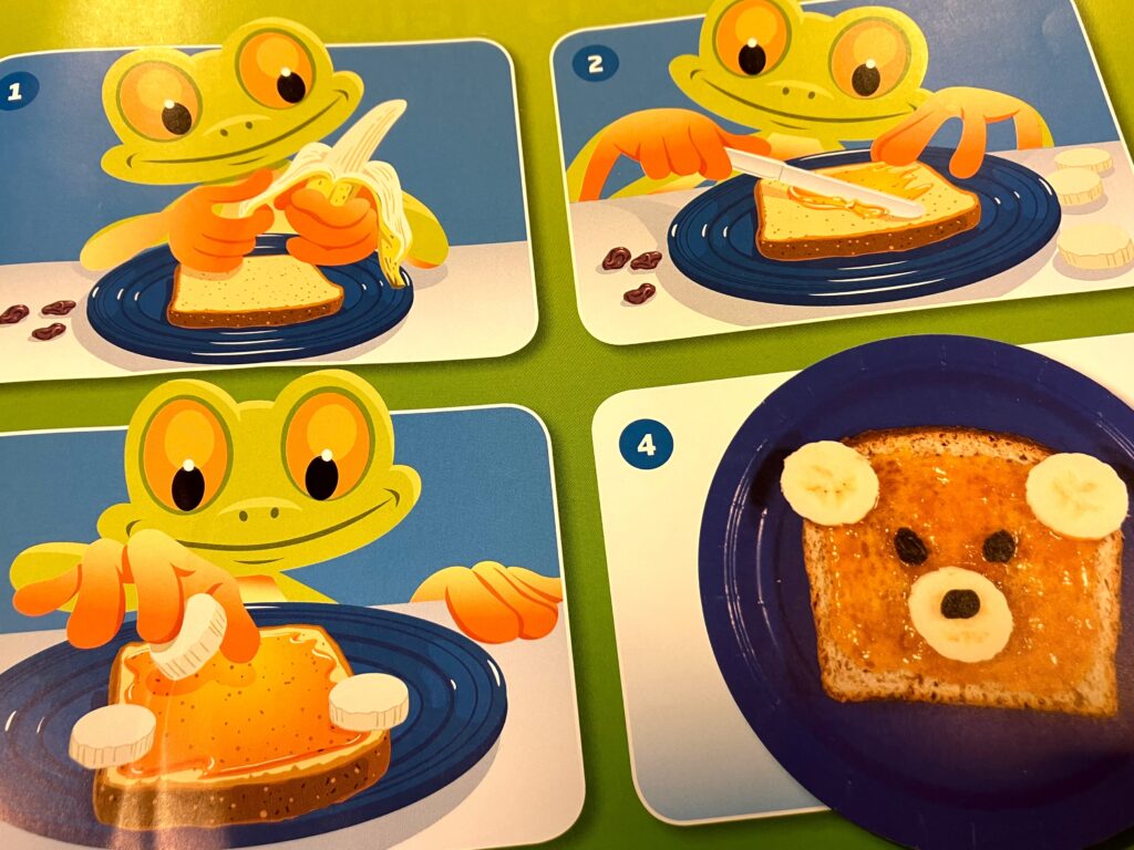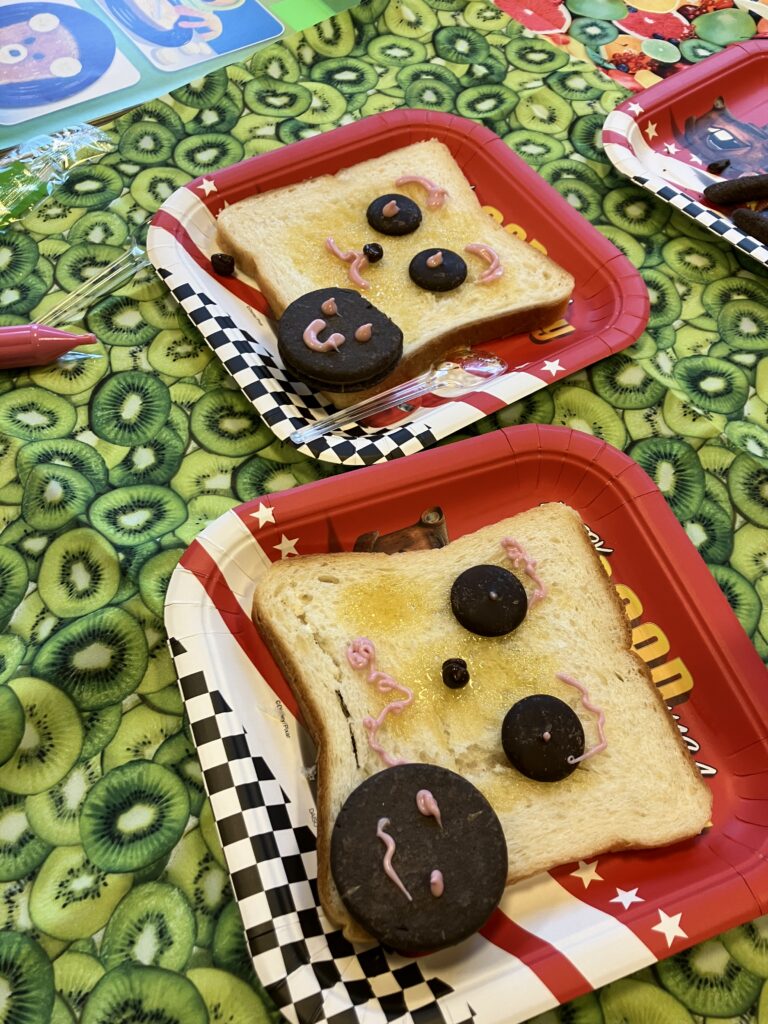 キッズクラスの待ちに待った美味しい😋日・・みんなのテキストにでてきたこれを作るためにbread,banana,honey,raison…顔のパーツ覚えたね