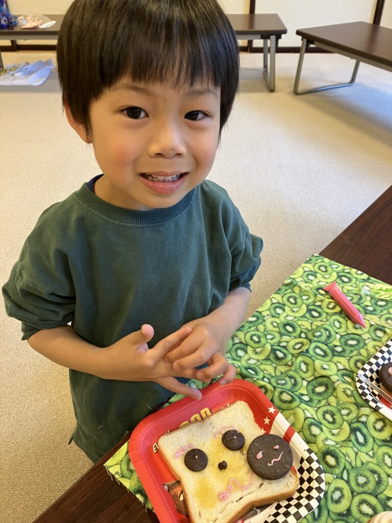 yummy!ほっぺがおちそうな笑顔であっという間に完食したね!いつもは残しちゃうとお母さまが言っていたけれど、自分でつくったお顔パンは最高だったね😊えいごで食育…happy♡yummy day