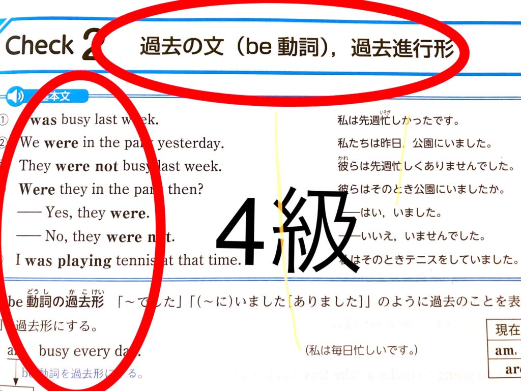 4級はさらにレベルアップ、過去形、過去進行形、未来形、接続詞、比較級、最上級もでてきます(;’∀’)