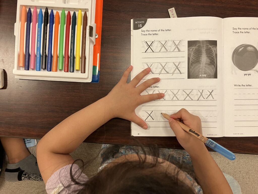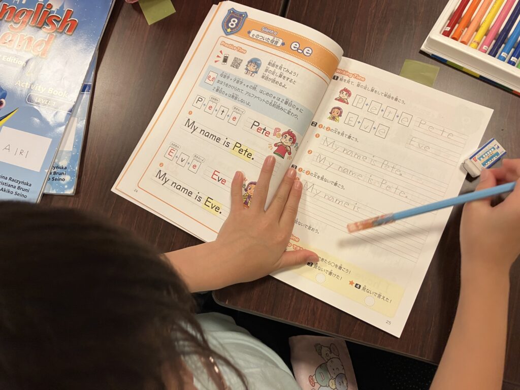アルファベットの大文字小文字ドリルが終わった子は、フォニックスと一文をまねて書く練習に移行、ほんとに頑張って練習する、意欲的な行動はみんなに伝染、素晴らしい👏先生嬉しい